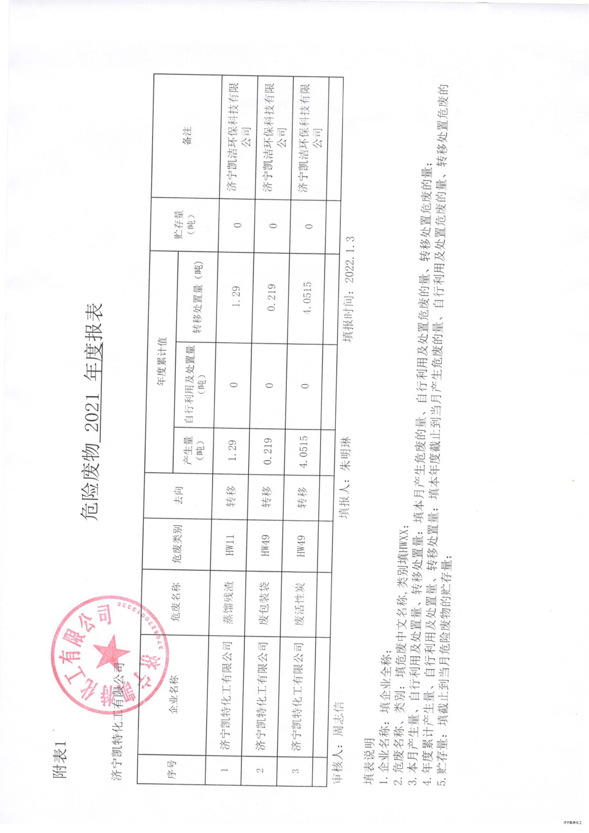 濟寧凱特化工有限公司2021年度危險廢物報表公示